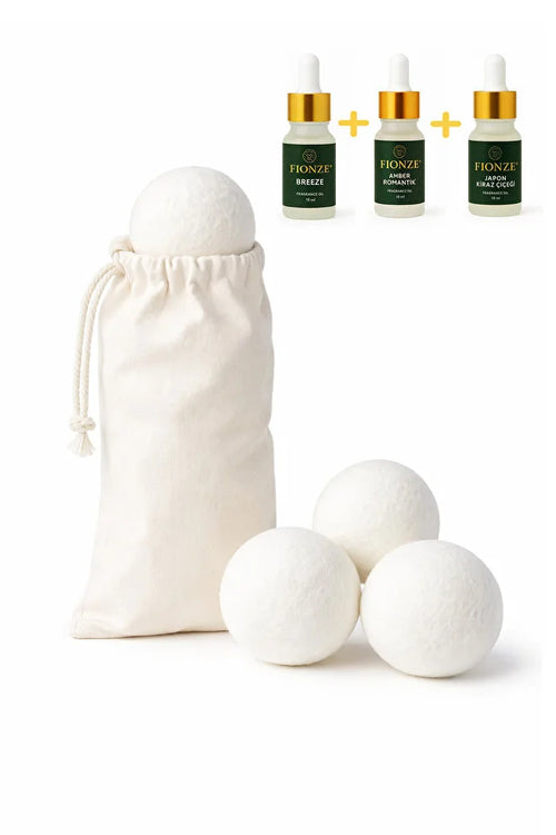 Çamaşır Yün Kurutma Topu ve Koku Seti 3 Adet Top (XXL) + 3 Adet Esansiyel Uçucu Yağ